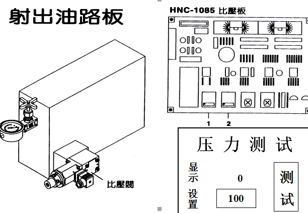 3、在【壓力設(shè)定】之【壓力測(cè)試】設(shè)定高壓100,看油表顯示是否為100kg/cm2,如否,則調(diào)整1處,高壓調(diào)整至相符。